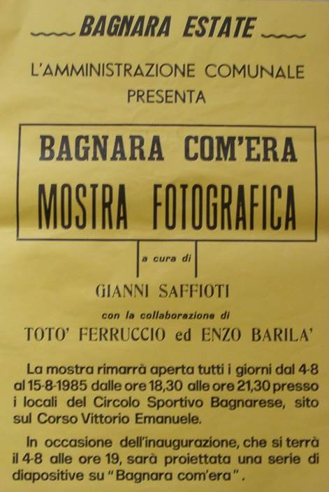 Inoltrarsi nel mondo antico ed affascinante della società bagnarese è stato come viaggiare indietro nel tempo, assaporare i ricordi narrati da decine di persone, gustare le bellissime foto realizzate da veri maestri dell'immagine come il prof. Luigi Cristina ed il fotografo professionista Francesco Iracà, o le bellissime cartoline di inizio secolo.